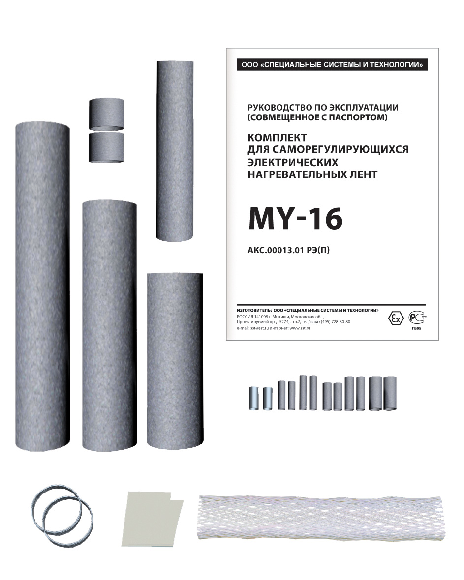Комплект MY-16 включает в себя термоусаживаемые трубки на основе полиэтиленовой композиции, припой, медную плетенку, фоторопластовую ленту.