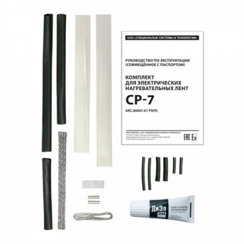 Комплект СР-7 включает в себя термоусаживаемые трубки на основе фторполимера, припой, медную луженую плетенку, фоторопластовую ленту и клей-герметик.