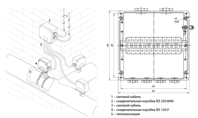 Коробка ВЭ 250.М40 предназначена для подключения силовых кабелей питания систем электрообогрева.