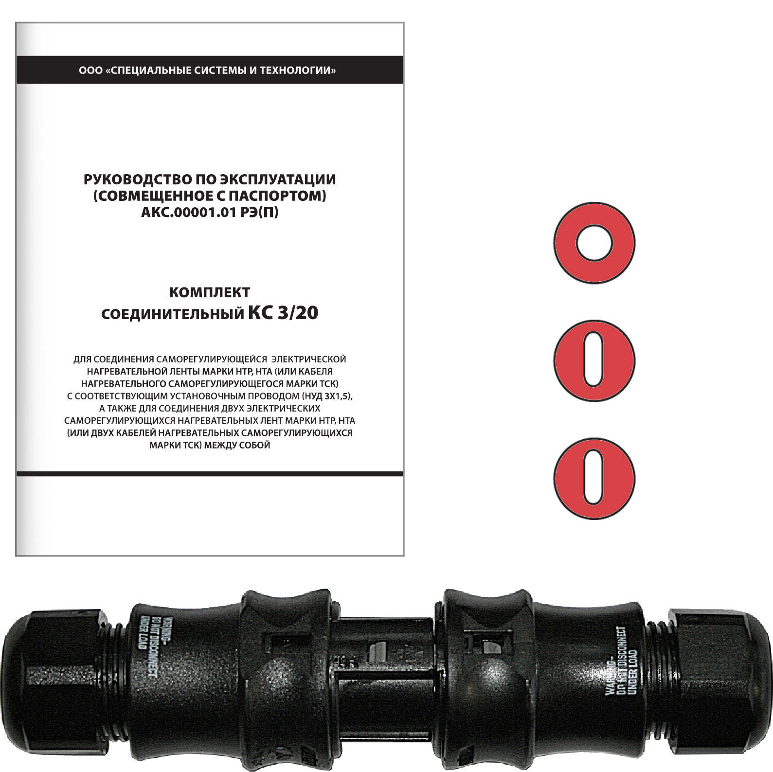Комплект соединительный КС 3/20 может с успехом использоваться в местах, где в дальнейшем возможен временный демонтаж отдельных частей системы обогрева: например, для ремонта и обслуживания арматуры на трубопроводах, очистки водостока и т. д. Так же комплект может использоваться для ремонта поврежденных участков лент/кабелей.