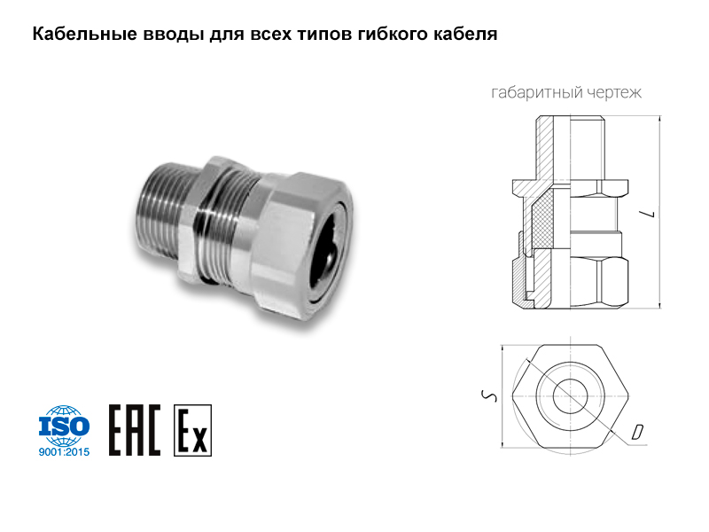 | Код исполнения | Присоединительная резьба | Диаметр внешней оболочки кабеля, мм | S, мм | D, мм | L, мм | Масса, г |
