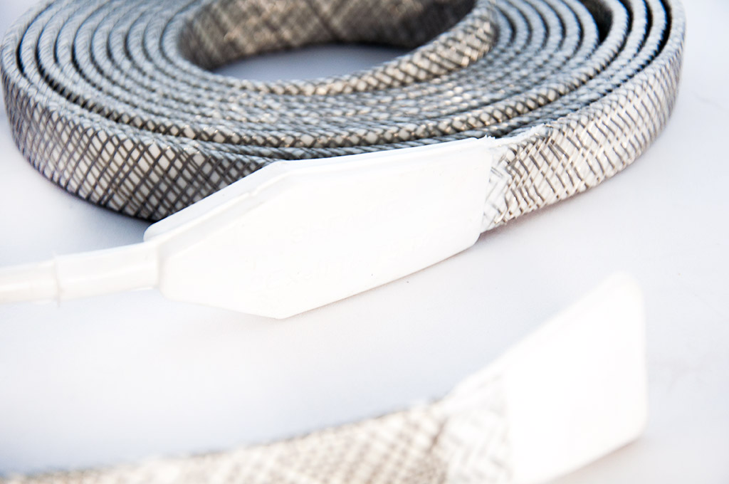 ЭНГЛ1Ех плетеная лента из стеклонити, в основе которой восемь нагревательных жил из проволоки высокого сопротивления. Снаружи нагреватели покрыты водонепроницаемой оболочкой из кремнийорганической резины. Концевые опрессовки выполнены из такой же резины. Изоляция из кремнийорганической резины особенно подходит для случаев применения, где необходима высокая гибкость ленты. Нагреватель имеет сплошную защитную оплетку из медной проволоки.