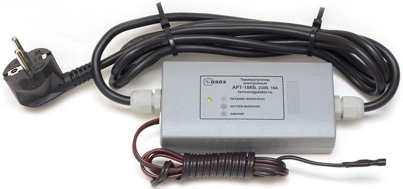 Терморегулятор АРТ-18КБ - специализированный терморегулятор для управления саморегулирующимися кабелями или лентами для защиты труб, водостоков, канализации от замерзания. Имеет фиксированную уставку +2°С (включает нагрузку при 1°С и выключает при 3°С). Комплектуется датчиком температуры длиной 1,5 метра, кабелем питания с вилкой с заземлением 1,7 метра, выводом для подключения саморегулирующегося кабеля. Имеет возможность подключения кабеля с заземлением.